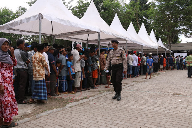 Dalam pembagian daging sapi dan kambing ini, pengasuh juga menyarankan agar warga bersabar secara bergiliran, tanpa harus berdesakan. Pembagian daging akan terus berlangsung hingga selesai sekitar 20 000 penerima, dengan berat 1,5 hingga 2 KG perbungkusnya. “Itu sudah terseleksi Mas,” sambung petugas dari DinKes, diamini oleh petugas dari Dispernak.
